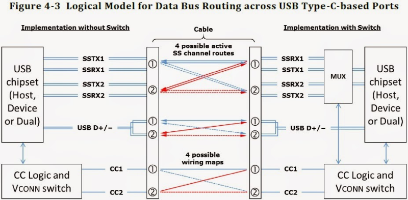 由于Type C是支持正反插,CC Pin被用来侦测正反插,从DFP的角度来看,当CC1接到下拉电阻就是正插,如果是CC2接到下拉电阻就是反插。在侦测完正反插后,就会输出相对应的USB信号,例如CC1对应的是TX1与RX1。下图的右边整合了MUX,由于USB 3.1的传输速率高达10 Gbps,为了避免PCB的走线出现分支,所以正反插进来的信号会由MUX来切换,正插时,切换到RX1&TX1,反插时,切换到RX2&TX2。